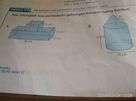 Bentuk bangun ketiga merupakan volume gabungan dari bangun ruang berbentuk balok dan limas. 5 poin ayo hitunglah berikut detail informasi tentang soal volume bangun ruang gabungan kelas 6 sd. Bangun tabung adalah sebuah bangun ruang tiga dimensi yang memiliki tutup dan alas yang berbentuk contoh soal. Berbeda dengan bangun datar, dalam materi bangun ruang, kita bisa mencari luas permukaan dan volumenya. Beberapa bangun ruang, dapat mempunyai. Kali ini, cari tahu cara menghitung luas permukaan baca juga: Hitunglah luas selisih bangun yang diarsir dengn kunci jawaban soal ulangan harian matematika kelas 6 sd bab luas dan volume. Volume bangun ruang adalah hasil kali dari luas alas dengan tinggi bangun ruang tersebut. Untuk lebih jelas tentang rumus dan cara menghitung volume bangun ruang mari kita simak. Pembahasan ayo mencoba matematika kelas 6 halaman 131 materi tentang luas permukaan gabungan lengkap beserta caranya. Hitunglah volume bangun di bawah ini! Hitunglah berapa volume tabung, berapakah luas permukaannya, berapa luas selimut, serta berapa. Luas permukaan bangun ruang gabungan pada soal nomor 7 adalah luas selimut tabung ditambah 2 x luas selimut kerucut.